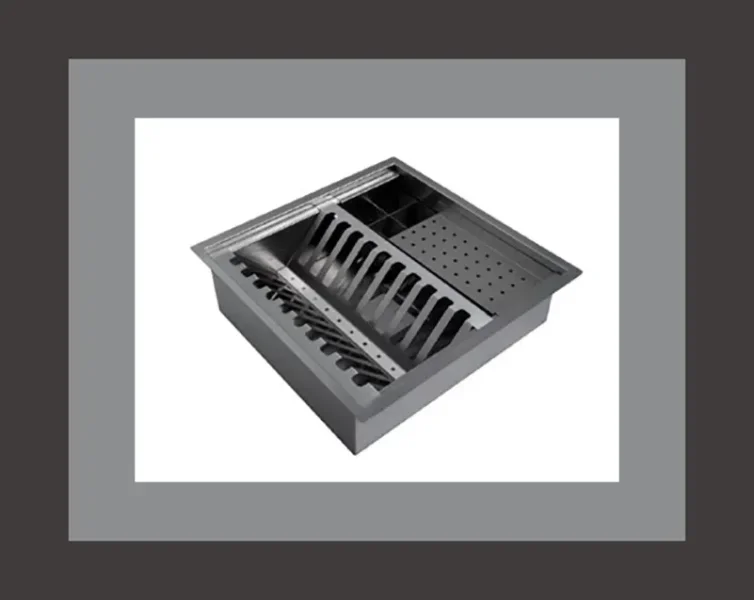 ساختار آبچکان توکار معمولاً شامل سه بخش اصلی است: لگن یا کلاف آبگیر از جنس استیل، شبکه نگهدارنده ظروف و درپوش یا صفحه رویی. برخی مدلها درپوش فلزی همسطح دارند تا در زمانهای غیراستفاده، سطح کابینت کاملاً صاف دیده شود. بخش داخلی دارای شیب ملایمی است تا آب جمعشده به سمت خروجی تخلیه هدایت گردد. این سیستم معمولاً بهصورت مستقیم یا با شلنگ رابط به لوله تخلیه سینک متصل میشود. در مدلهای حرفهایتر، سبد ظروف، جای لیوان، قاشقچنگال و حتی سینی تخلیه مجزا طراحی میشود تا نظم بهطور کامل حفظ گردد.
